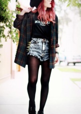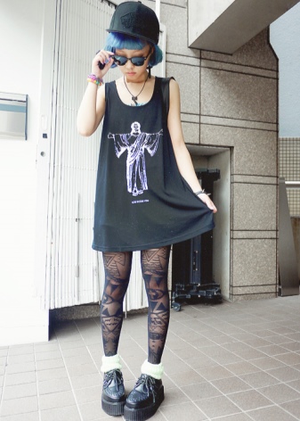 Girls can afford to wear torn tights in combination with a short leather skirt. Blouses must be translucent. A school uniform is allowed, but with elements of provocation. Shoes on a massive platform are selected as shoes. Appropriate makeup - eyes summed up with a black pencil, dark, almost black lipstick and the same nail polish.