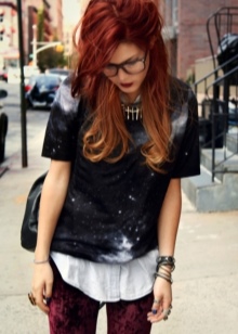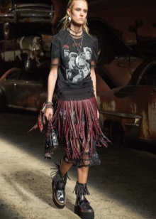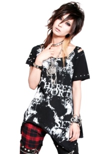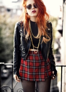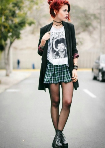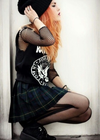 Punk is a popular cell. Therefore, in the wardrobe must be such a pleated skirt and tight pants. It is recommended that you also have a black T-shirt with a skull or a famous person from punk culture.