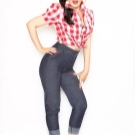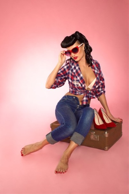 In the pin-up style, a rich checkered shirt looks very harmonious and attractive. It should be tied in such a way that the woman’s tummy is open. But do not forget that such clothes will look good only on slender and fit fashionable women.