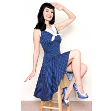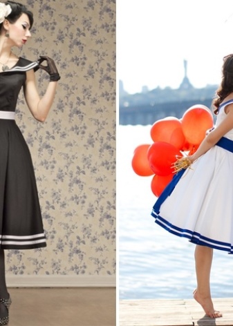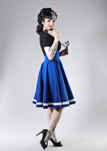 - On fashionistas, fitted dresses with a wide skirt just look fabulous. You can pick up things in a marine style. Such specimens are equipped with collars, like sailors. It is worth choosing outfits in which there are contrasting white lines on the collar and bottom of the skirt. Such ensembles can be supplemented with short gloves, a large hairpin in the form of a flower, a small handbag and a pendant around the neck.