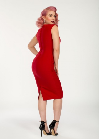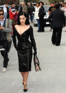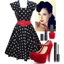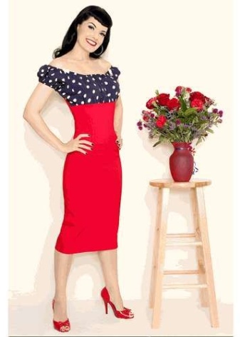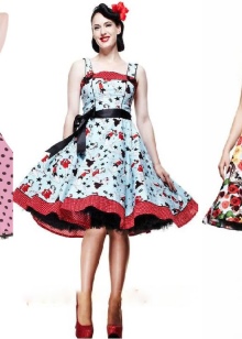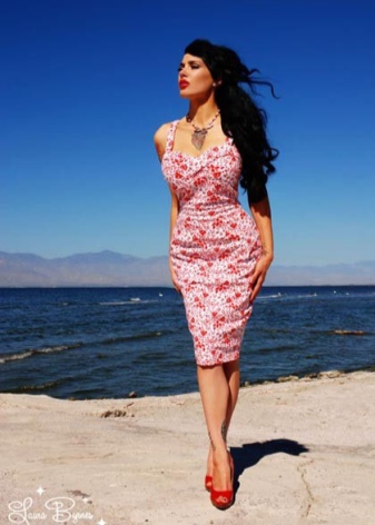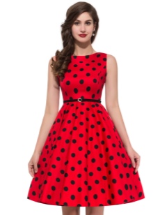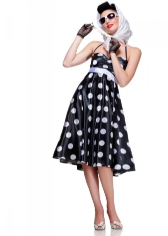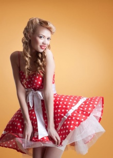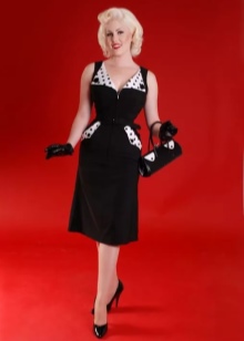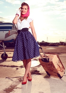 - On flirty ladies, a dress just below the knee with a sexy neckline will look perfect. The outfit can be matched in black with white peas. It is recommended to choose things in which the sleeve is very short or not at all. You can complement the sexy set with a belt at the waist, a bright red bandana and red patent leather shoes of the style of Mary Jane.