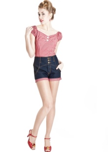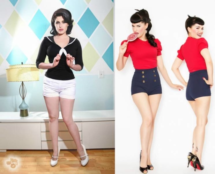 - If you like to wear shorts, then you should create a vivid pin-up look with such a detail. Just pick up shorts with a high waist and a plain blouse with a long or short sleeve. The ensemble can be complemented with feminine stilettos with an open toe.