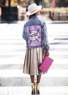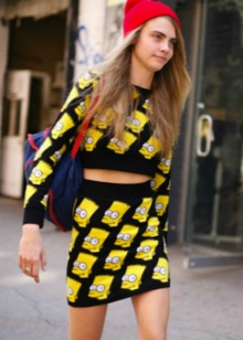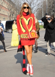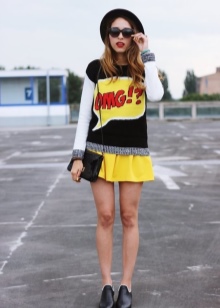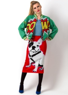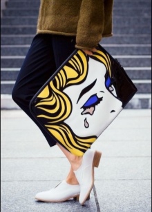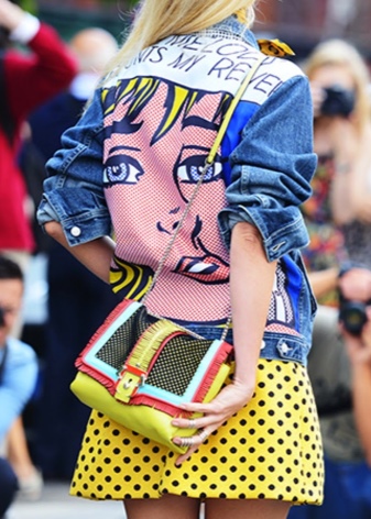 - You should use bright and recognizable details of the pop art style. It can be a bag in the form of red lips and with a protruding tongue. Maybe a jeans with a huge inscription "BOOM!" Skirts or sweatshirts with portraits of famous personalities are fashionable now. Just remember that the street is not a catwalk on the catwalk, which means that a couple of bright details are enough for everyday onions.