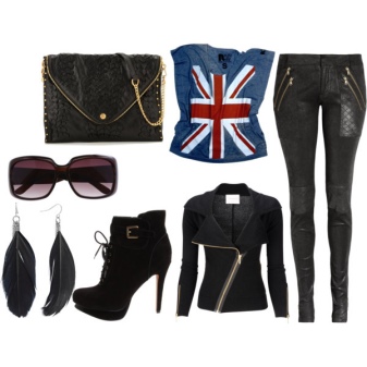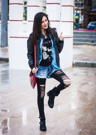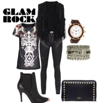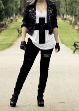 - Hard rock can be recreated from any daring things: leather leggings, leather jackets and ripped jeans. An important role in the image is played by accessories. They must have an aggressive design.