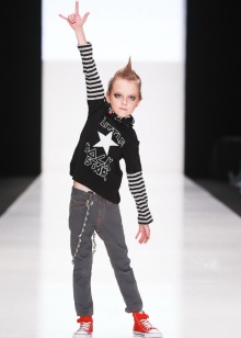 On a small fashionista or fashionista you can wear a dark T-shirt with a contrasting pattern, a black bandana and dilute this ensemble with funny wristbands. It’s quite possible to throw a small leather jacket upstairs.
