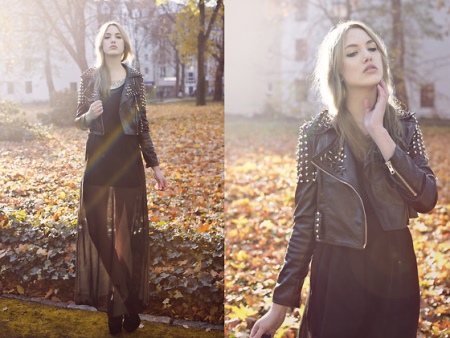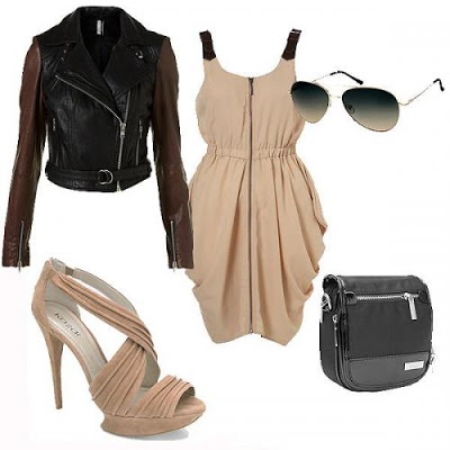 - It will look great with an airy fitted cream-colored dress, black leather jacket and beige heeled sandals. You can complement the image with the help of sunglasses and a purse bag.