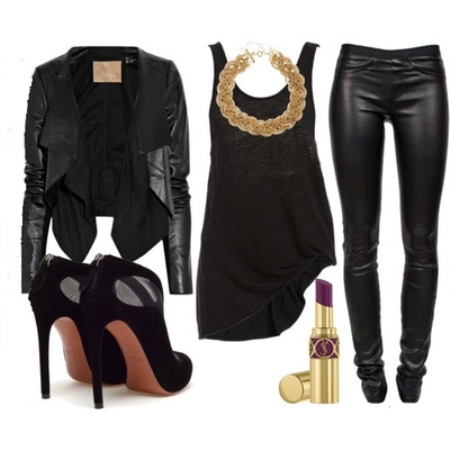 - Choose leather leggings, a light dark blouse, a cropped leather jacket, and high-heeled ankle boots. You can decorate the image with the help of golden accessories.