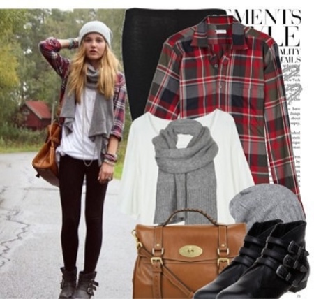 - Pick up a light sweater with a long sleeve, dark jeans and a plaid shirt. Jeans can be replaced with shorts. Complement this ensemble with black small heeled boots and a brown leather bag. In cool weather, you can wear a gray hat - a stocking and a scarf.