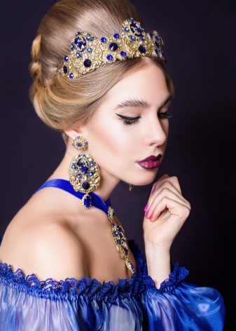As for hairstyles, it is best to match the image of a high styling, decorated with a rim.