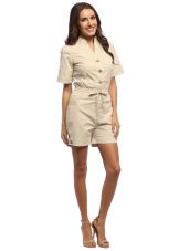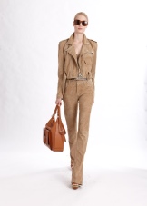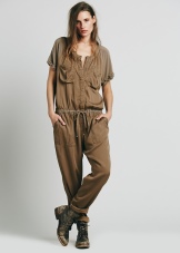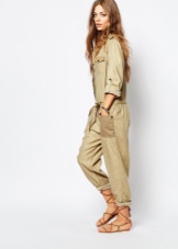 Another bright and functional thing in the safari style - a jumpsuit - combined a loose-fitting shirt with a style-specific decor and tight trousers with an ankle length. Such an outfit will be a great option for walking, outdoor activities and going to the movies, but as an office option, it will not work. For a romantic date, you should also choose a more feminine image.
