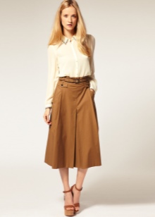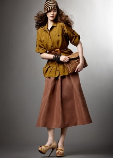 For less formal feminine looks, another model typical for this style is suitable - a skirt-sun. Such a model in a wonderful way with the help of folds hides too full hips or adds volume to thin girls. To complete the image for such a skirt, it is also necessary to choose a shirt-style jacket with various characteristic decor. For hot days, you can choose a shirt with short sleeves.