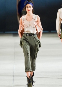 Safari pants are very similar to military-style models. The presence of patch pockets and locks, buttons and buttons is characteristic of both styles and makes this wardrobe item functional. Combining trousers with a jacket or t-shirt, you can go on vacation or on a trip.