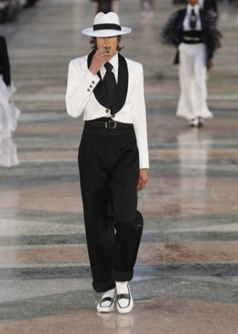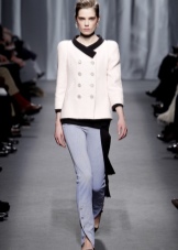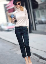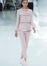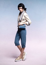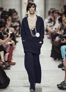 Another option for self-confident women can be pants made of materials such as silk or satin. They will look especially stylish, made in trendy shades such as dark blue or cool green. The most faithful complement in the style of Coco Chanel in this case will be a shortened vest with long sleeves. A beige bag combined with shoes of the same shade will elegantly complete the look.