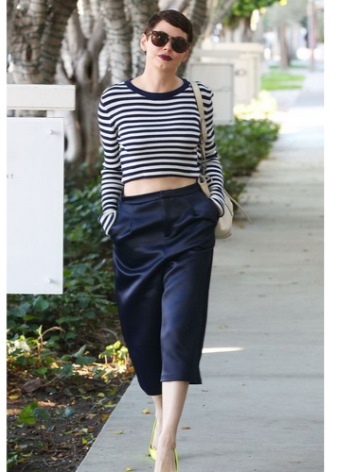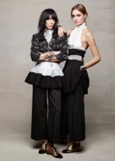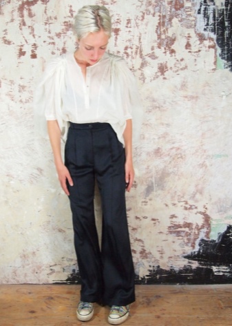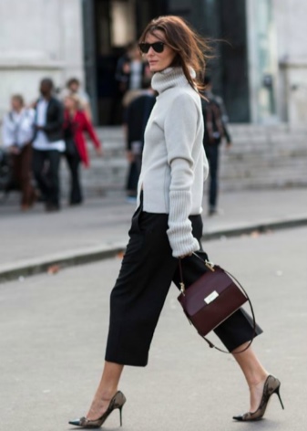 Naturally, a wardrobe in the Coco Chanel style is unlikely to do without stylish models of mid-rise culottes. They are able to transform any girl, making her an object of attention. A very effective look can be obtained with the help of classic wide black trousers with a length above the ankle. In this case, the highlight will be the presence of a voluminous woolen sweater in combination with stilettos.