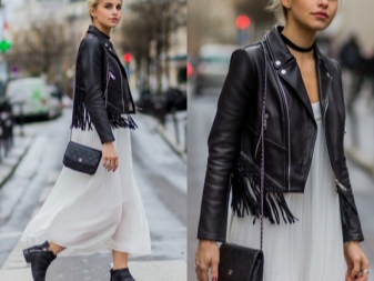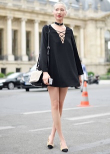 A black fitted strapless dress is a great option for a young active girl who needs a stylish bow for evening walks in the city with friends. So, a very effective choice will be a simple cut model, complemented by a stylish leather trim. A blazer in color with decorative pearl elements and a necklace will effectively accentuate the bow. In this case, obviously, the two-color boats will become the most suitable shoes.