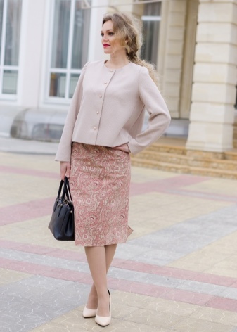 To create a romantic look, you need to choose a straight-cut dress and a cozy jacket made of dense material in color. For example, you can combine a trendy pale pink dress with a midi length, complementing it with a cashmere jacket with buttons without a collar. Such a tandem will emphasize the charm and sophisticated taste of its owner. Supplement the bow with a small handbag in a neutral shade and nude stilettos with a sharp toe.
