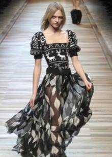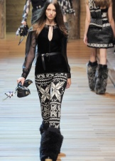 A combination of a long chiffon skirt and a voluminous sweater or a dress with suede boots or high fur boots on fur can be called quite bold.