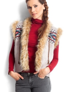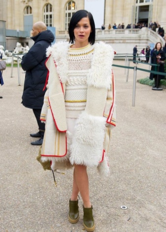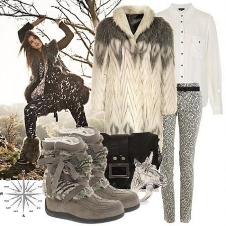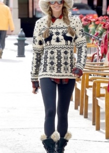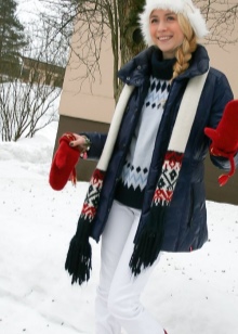 If we talk about spectacular images, then a sweater with a traditional ornament, suede ankle boots, a short sheepskin coat with a fur collar can become a beautiful combination. Leather gloves, a large hat on fur, and a bag with fur trim will complement the created bow.