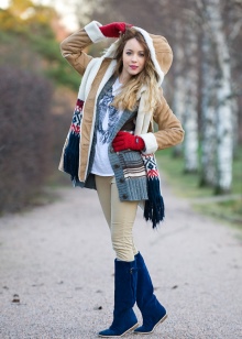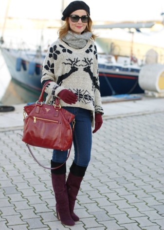 With warm clothes, as already mentioned, jeans look great. You can take a sweater, a jacket made of suede, as well as boots made of the same material. A knitted scarf with an ornament and a bag will complement this image.