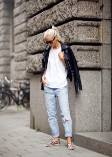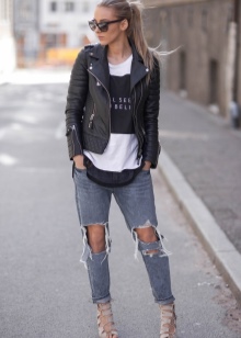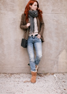 Leggings and jeans can be combined with bright T-shirts and complement with uggs. Looks no less impressive and stylish, consisting of denim shorts, a top and a thin cardigan. At the same time, a ragged cut and an asymmetrical hem of the bottom are welcomed in creating the image.