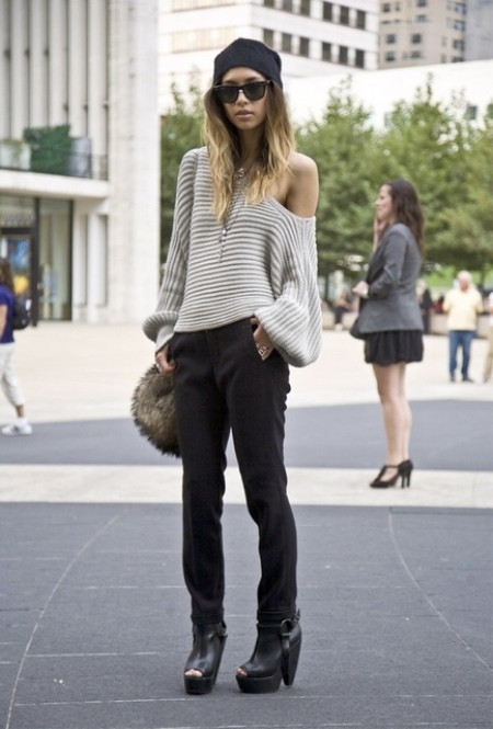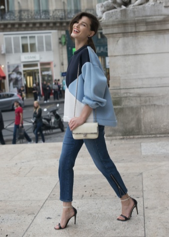 This year, a combination of the top of a free cut with a tight bottom, for example, a duo of oversized sweaters and jeans, is relevant.
