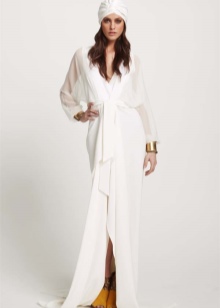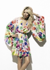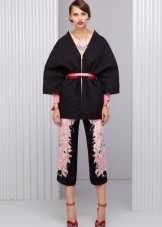 - Kimono, which is a symbol of the Land of the Rising Sun, today is presented in different versions. Wide sleeves, a T-shaped cut, appropriate drapery and a tucked-up hem of the skirt give a certain charm. Over time, the classic outfit has changed. Today, many models are no longer perceived as the national costume of Japan. Most of them have an insert at the waist, imitating a belt. Modern products of different lengths. They can be worn not only by slender young ladies, but also by those who have magnificent forms, wide shoulders, a narrow basin and an apple shape.