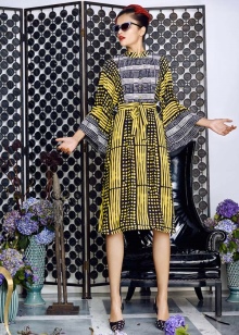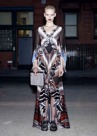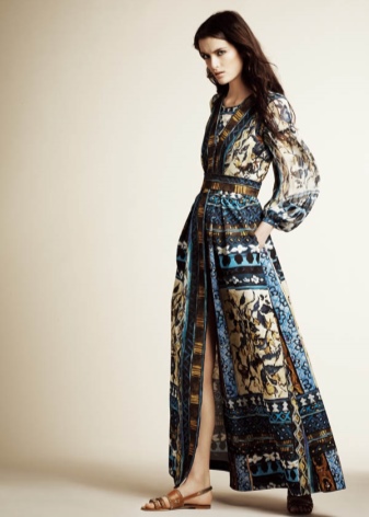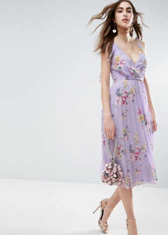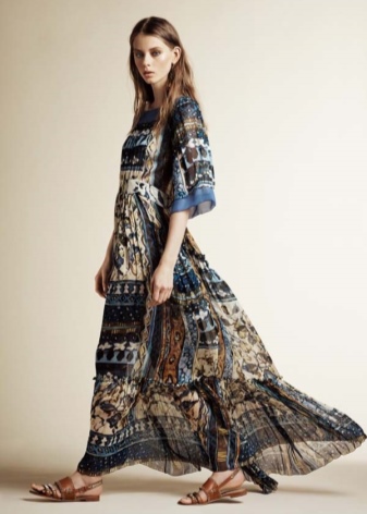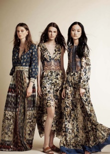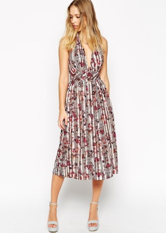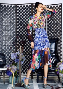 - Oriental dresses with print and pleating are suitable for evening walks.Such things emphasize fragility and femininity. Contrast inserts can visually lengthen the figure and hide many imperfections. This year, both warm and cool colors are in fashion.