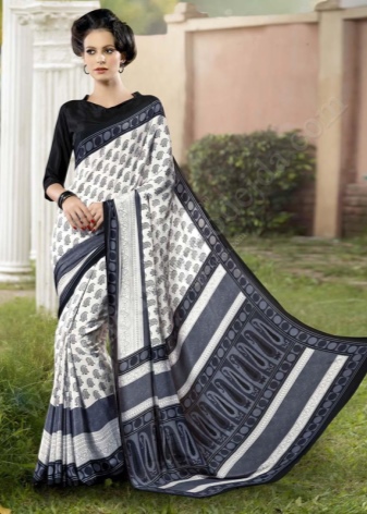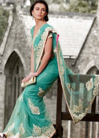 A sari is a certain-sized fabric that wraps around the waist and spans over the shoulder. For its tailoring, linen, cotton or satin of different colors and shades are used, with a pattern, embroidery and ornament. Bright large bracelets, beads, pendants, earrings and necklaces are used as accessories for such clothes.