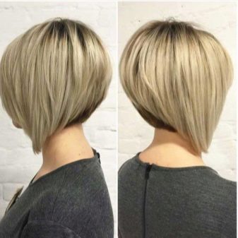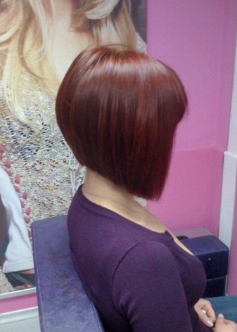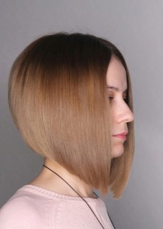 - Corner "bean" "on the leg" It will look perfect on light and dark hair. A bewitching image will create an elegantly designed part of the nape and volume on the crown. This haircut is preferred by energetic girls who do not like to spend a lot of time styling in the morning.