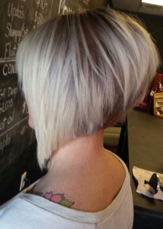 - "Bob" "on the leg" in the French style Looks perfect on thin hair. Due to the pronounced neck line, the hairstyle will add extravagance and effectively emphasize the swan neck. The technique consists in a thin-layer haircut, when each of the tiers is lengthened by a subsequent millimeter. Sharp lines and asymmetric locks will help to focus on the eyes.