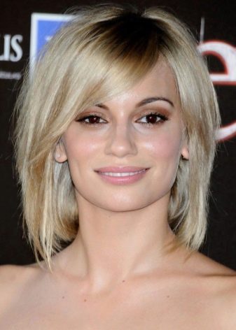 A characteristic feature of the square face is expressive cheekbones and a relatively massive lower part. Here, the hairstyle should give rude features of softness and prettiness. In this case, the best option would be an elongated bob with bangs to the side.