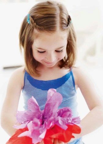 - It is necessary to choose accessories for the selected haircut. It can be all kinds of headbands, hair clips, crabs, elastic bands in any color scheme and design. Even hairstyles with short hair lengths need their own accessory, which will give your child charm and personality.