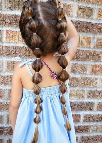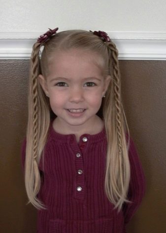 - Long hair is decorated in a beautiful hairstyle. The combination of tails and weaving looks harmonious, and annoying locks do not interfere with the child.