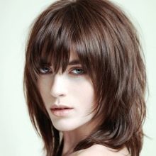 - Sometimes haircuts are also considered separately. to the shoulders with bangs, although in most cases they are a variation of one of the above hairstyles and in the circle of stylists may have a completely different, special name.A relatively short hair does not mean that the face should be completely open - the girl herself decides how long the bangs should be and how much it covers the forehead and cheekbones. Acceptable options are oblique, and straight, and milled bangs - it all depends on your preferences.