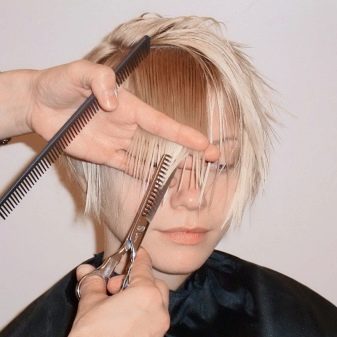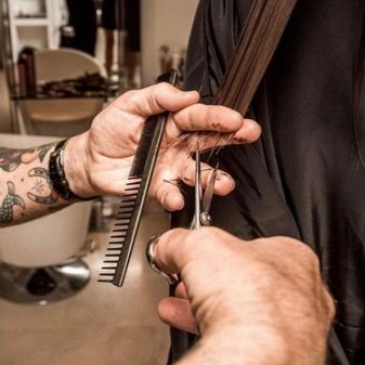 To locks lay as it should, masters recommend resorting to thinning temples and tops. It is permissible to refer to a technique called “picket”, due to which the tips of the hair are provided with the required position. To perform the specified technique, the hair should be cut over the comb. The strands must be scratched against the growth of hair. Those hairs that protrude beyond the teeth of the comb will need to be cut with the “scissors”, holding the device itself at an angle of 50 degrees.