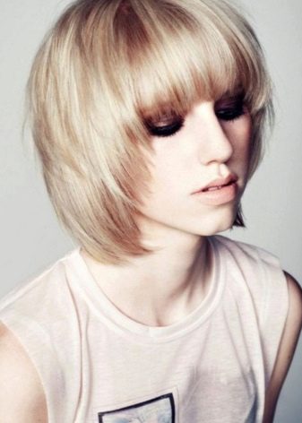 Hair after cutting should have a short length at the back of the head, but without exposing the neck to the neck. Masters recommend wearing this type of hairstyle with or without bangs. If bangs are short, then this adds an image of playfulness and spontaneity. And when she long (to the eyebrows) and rather thick, eyes are more prominent in the image. They become more vivid and mysterious.