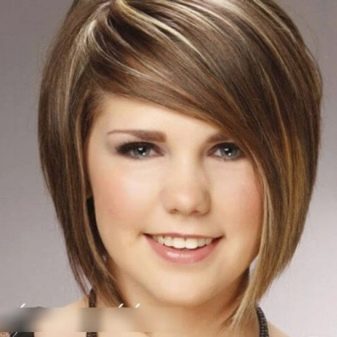 - Round. Cheekbones wide, round face. A rear haircut should be done with an open nape, and in front - below the cheekbones line to narrow your face. A short square with elongated front strands without bangs is what suits chubby girls. Elongated strands visually stretch the face and hide its fullness.