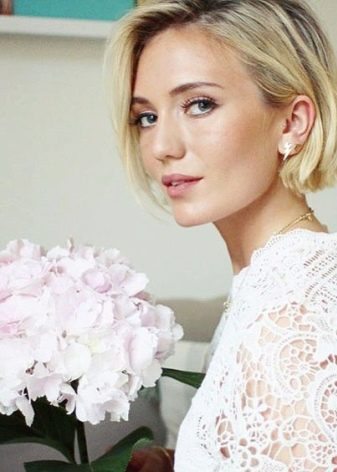- Short square with lengthening. Around the face - long ringlets, behind everything is short cut. Nape and neck open. The hairstyle does not require special care, and long curls in front visually lengthen the face.