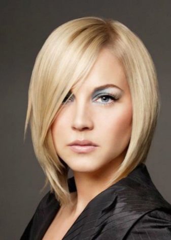 For women with an angular shape of the face (like a trapezoid), the option with a bangs is suitable, which visually hides the appearance flaws. At the same time, it is desirable that the bangs be without clear and direct forms. The best option is a step haircut with a long bang, combed to one side. The thick slanting bangs also perfectly simulate an excessively elongated and pointed chin.
