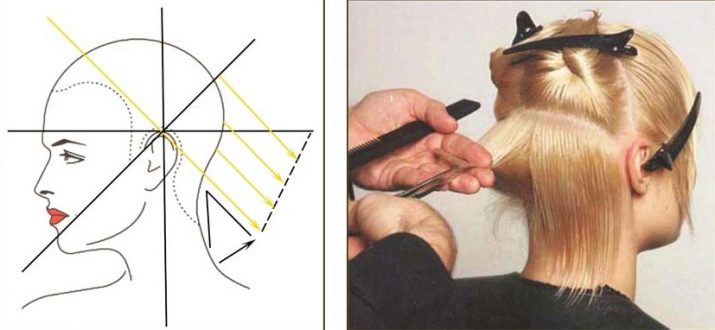 - The next step is to create a foundation in the form of a classic square. With each part using the horizontal parting, the necessary amount of hair is separated and cut so that subsequently they overlap the lower strands. The master begins to cut from the neck, smoothly moving to the temples. The hairdresser goes to the crown and bangs, if planned, at the very least.