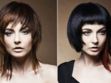 A cascading haircut in tandem with a straight bang can hide a very high forehead. For those who have small facial features, but an elongated nose, this option is also suitable. With a rectangular shape of the face with high cheekbones, you should choose a cascade and a straight bang to the level of the eyebrows. Oblique locks of bangs will make a round or square face more attractive. This haircut is suitable for elongated bangs with a side toe and a straight bang with torn ends.
