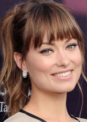 Volumetric wide bangs are good. You should choose options that visually expand the face. A good example is the French straight bang. Do not use oblique elongated options. It is better to stay on short bangs covering the eyebrows.