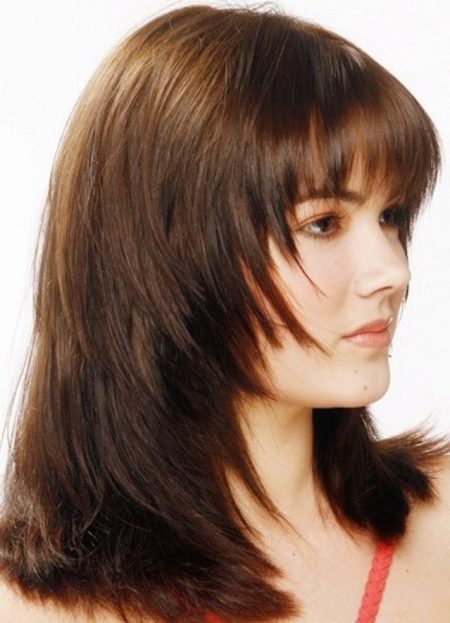 Also, to adjust the shape of the face, it is necessary to use bangs. Previously, the cascade for medium hair with bangs of medium density was the most relevant. At the same time, the fair sex, who have a face "heart", preferred bangs, combed to one side. Both options adjacent to the face, and voluminous, were welcomed.