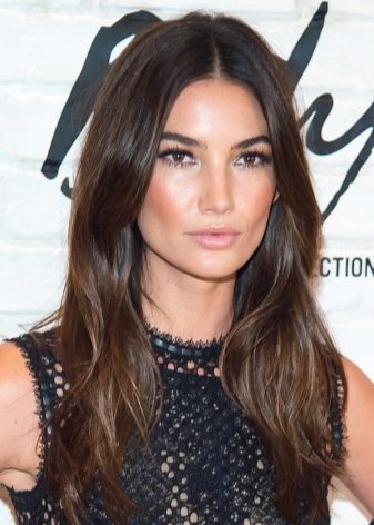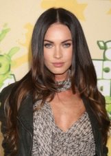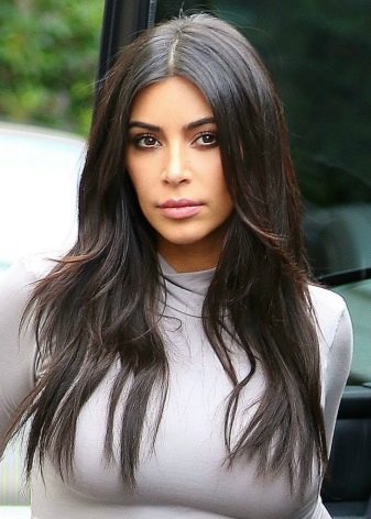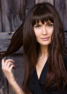 Shining dark chocolate or black straight curls with tips twisted inward will decorate the lady's image. If a haircut without a bang, then it will attract attention to the eyes of the fashionista.