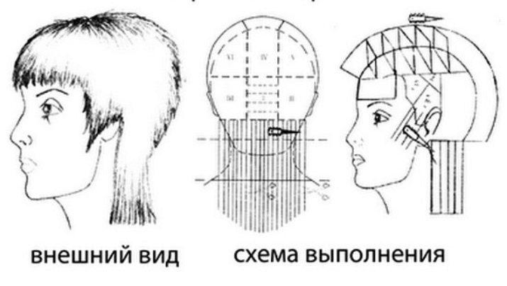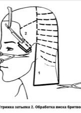 - Then proceed to a direct haircut, the scheme and technique of which is similar to the haircut haircut. It should be cut from the back of the head, previously creating horizontal partings from the borders where hair growth begins. You need to do this at a right angle, slightly pulling and combing the strands. After that, using the technique of applying one strand to another, the remaining strands of hair are cut, strictly observing a straight line. As a result, the nape area is clearly marked.