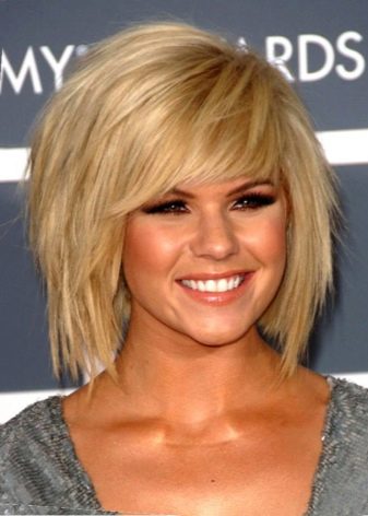 - Aurora. Such a haircut will look advantageous with any face shape except round. As for the bangs, here is a side option. Length in this case does not play a decisive role.