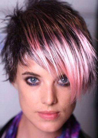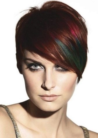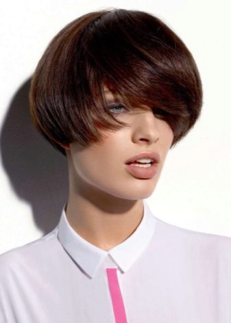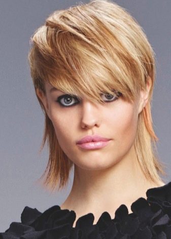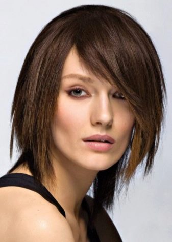 Shortened bangs on one side give the image of audacity, originality.She does not need additional styling. This option is most often chosen by the younger generation, representatives of any subculture.