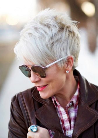 For owners of gray hair who want to emphasize their natural color, you can recommend a youthful bob for an average length. An interesting short classic version of a pixie haircut with torn bangs will also be interesting. The combination of enthusiasm and gray hair will be quite harmonious in this image.
