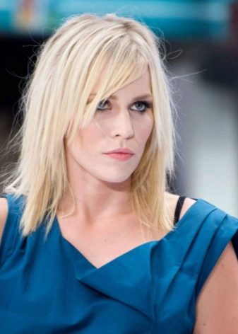 Torn edging will embellish the girl’s face, hiding small natural defects in appearance, for example, pronounced cheekbones, full cheeks or forehead height. Asymmetrical haircut performance can be both smooth and sharply defined on the background of the face. Shaved areas and hair curls contribute to the selection of the optimal combination of hairstyles for medium hair.
