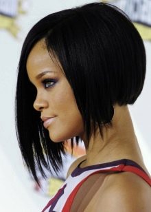 Bob with elongated front locks and short hair in the back of the head is a very interesting and trendy solution.In this case, the bangs may be present and be laid sideways. The color of the hair is permissible to make light, and the tips darken.
